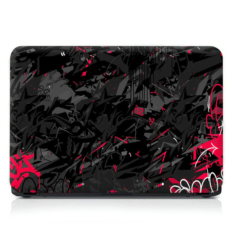 This laptop skin features a bold and edgy graffiti design, primarily in shades of black and dark gray, with striking red accents. The pattern is chaotic and dynamic, capturing the essence of urban street art with its sharp lines, abstract shapes, and layered textures. The red highlights punctuate the design, drawing the eye to various points and adding a sense of movement and energy.
